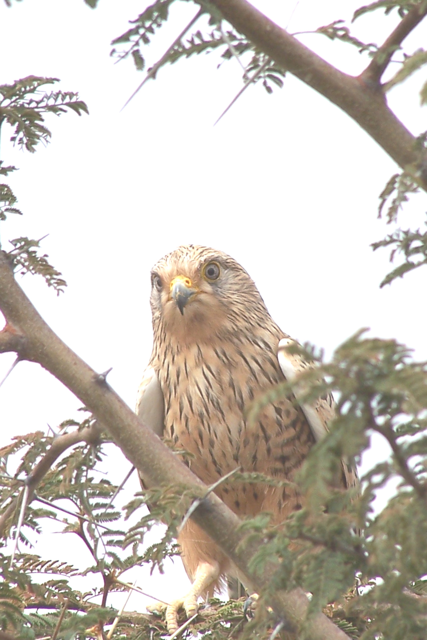 Much of the rest of the country consists of the Kalahari sandveld ecosystem, a mixture of low shrubs and bushes interspersed with patches of woodland. The more arid central and south-west areas support red-capped lark, grey-backed sparrowlark, capped wheatear, double-banded courser, greater kestrel, acacia pied barbet, crimson-breasted shrike, ostrich, kori bustard, northern black korhaan, Caspian plover, Cape crow, Kalahari scrub-robin, black-chested prinia, Marico flycatcher, scaly-feathered finch, lesser grey shrike, rufous-cheeked nightjar, Sabota, fawn-coloured and rufous-naped larks, swallow-tailed bee eater, lesser masked weaver, gabar and southern pale chanting goshawks and black-chested snake eagle.