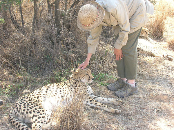 At each place we stopped, by the trees in front of the Parliament building, at the Botswana Defense Club, on the road to Mochudi, Mma Ramotswe's ancestral home, or by the railroad tracks where her mother died, Joe would read an excerpt from the series in his beautifully accented English. We also stopped at the set of the television series filmed in 2007, now surrounded by a chainlink fence with guard, the trees growing in around the little detective agency at the foot of Kgali Hill. We also visited the Mokolodi Nature Reserve, featured in the book "Blue Shoes and Happiness," for a game drive, giraffe tracking , and picnic lunch under the trees. We also got to pat the two tame cheetahs that had been orphaned as babies.