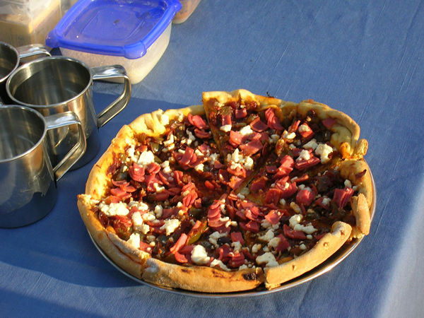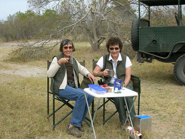 Around about 4:00 or 4:30, Bailey would get out the tea things, and we would have refreshments before setting off on our evening game drive. One night we had Fred's "bush pizza," a beautiful creation of homemade dough, ham, and feta cheese, cooked in a pot over a wood fire. Then we would set off into the bush again, occasionally encountering other safari vehicles. Mike and the other driver would have a brief conversation in Setswana, and he might say, "They heard there's a leopard ahead," and we would be off at top speed to join a small group of other vehicles watching a leopard in a tree. By 6:30 or 7:00 we would return to camp and eat by lamplight, served by Fred in his white chef's coat. Baked chicken with wild sage, potatoes au gratin, roast vegetables, pasta Bolognese with meatballs, sausages, squash soup, salads, and hot bananas drenched in bittersweet chocolate and nuts enchanted our nights. The man was a genius! One night we toasted marshmallows around the fire. Evenings we slept to the sounds of territorial hippo grunts or the trumpeting of elephants far off in the trees.